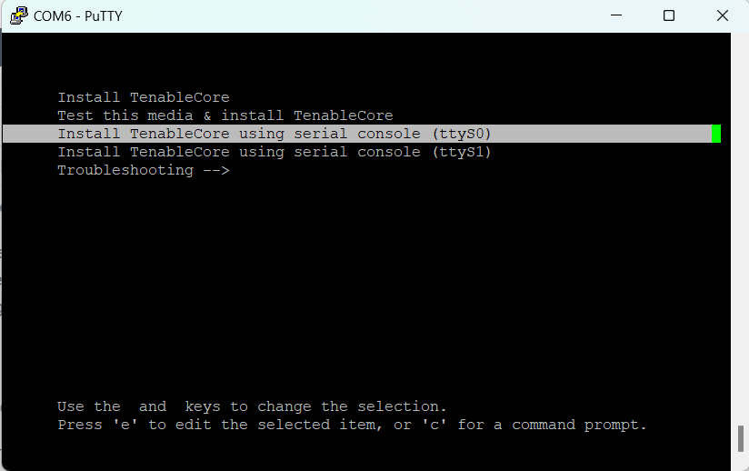 Après le redémarrage de l'appliance et lorsque vous y êtes invité, sélectionnez Install TenableCore using serial console (ttyS0) (Installer TenableCore à l'aide de la console série [ttyS0]). De cette façon, le résultat de l'installation est envoyé à la connexion de console série de l'appliance.