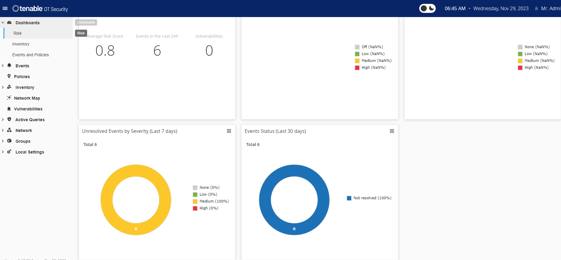OT Security active le système et affiche la fenêtre Dashboard > Risques.