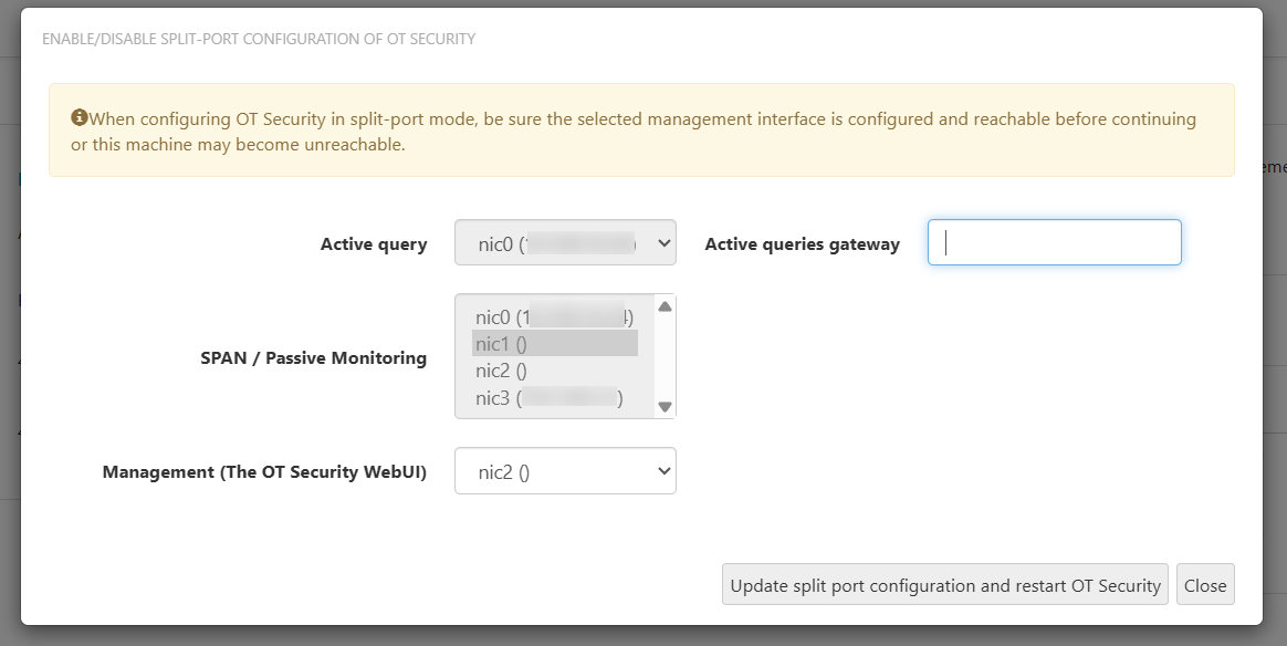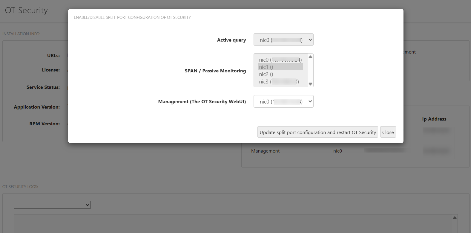 Cliquez sur Update split-port configuration and restart OT Security (Mettre à jour la configuration des ports fractionnés et redémarrer OT Security).