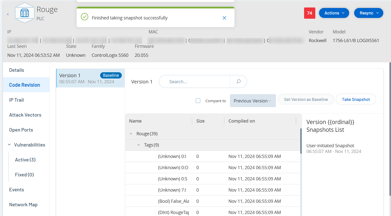 L'onglet Révision de code (pour les contrôleurs uniquement) affiche les différentes versions du code du contrôleur capturées par les « instantanés » de OT Security. Chaque version « instantanée » inclut des informations sur la révision du code au moment où « l'instantané » a été pris, en incluant des détails sur des sections spécifiques (blocs de code/séquences) et des tags. Chaque fois qu'un « instantané » n'est pas identique à « l'instantané » de ce contrôleur, une nouvelle version de la révision de code est créée. Vous pouvez comparer les versions pour voir quelles modifications ont été apportées au code du contrôleur.