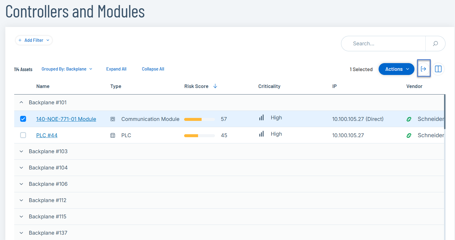 Remarque : lorsque vous modifiez des segments réseau en bloc, filtrez d'abord vos assets par type, puis sélectionnez les assets que vous souhaitez modifier en bloc. Les assets avec plusieurs adresses IP ne peuvent pas être inclus dans une modification en bloc pour les segments réseau ; vous devez modifier chaque asset manuellement.