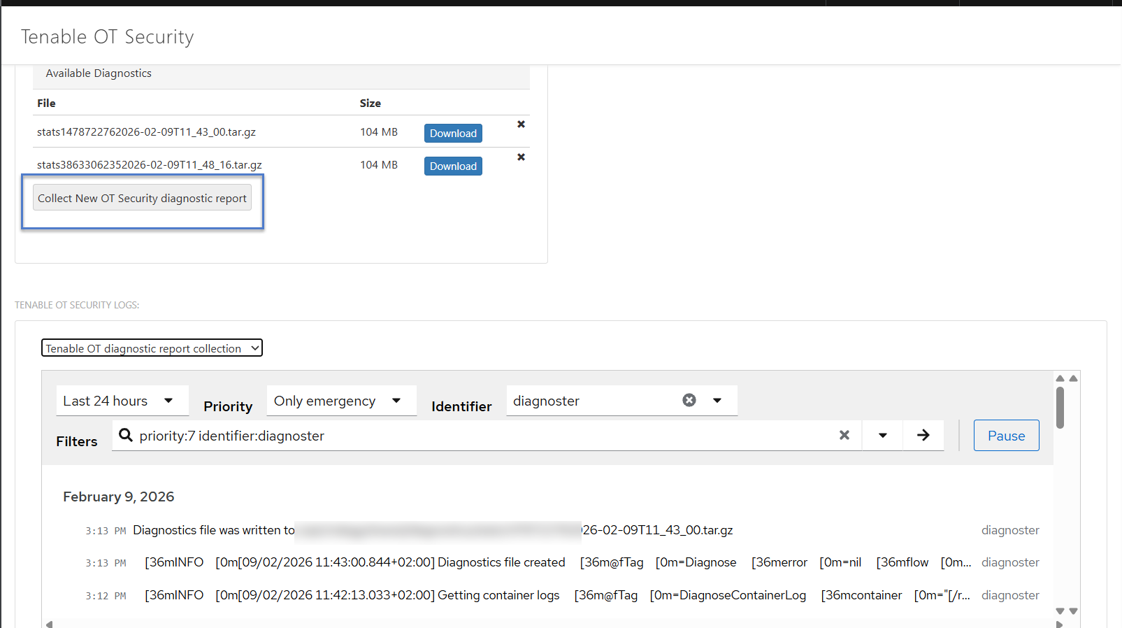 Vous pouvez générer et exporter un rapport de diagnostic spécifique à Tenable OT Security à partir de Tenable Core à des fins de dépannage.