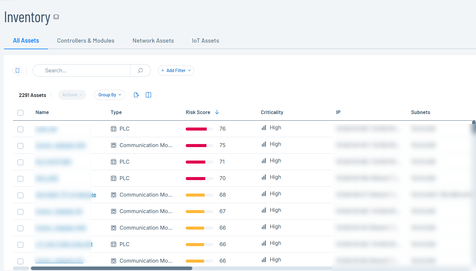 Tous les assets du réseau apparaissent sur les pages Inventaire. Les pages Inventaire contiennent des données détaillées sur l'asset, permettant une gestion complète des assets ainsi que la surveillance de l'état de chaque asset et des événements associés. OT Security collecte ces données à l'aide des fonctionnalités de détection réseau et de requête active. La page Tout affiche les données de tous les types d'assets. De plus, des sous-ensembles spécifiques d'assets sont affichés sur des écrans distincts pour chacun des types d'assets suivants : Contrôleurs et modules, Assets réseau et IoT.