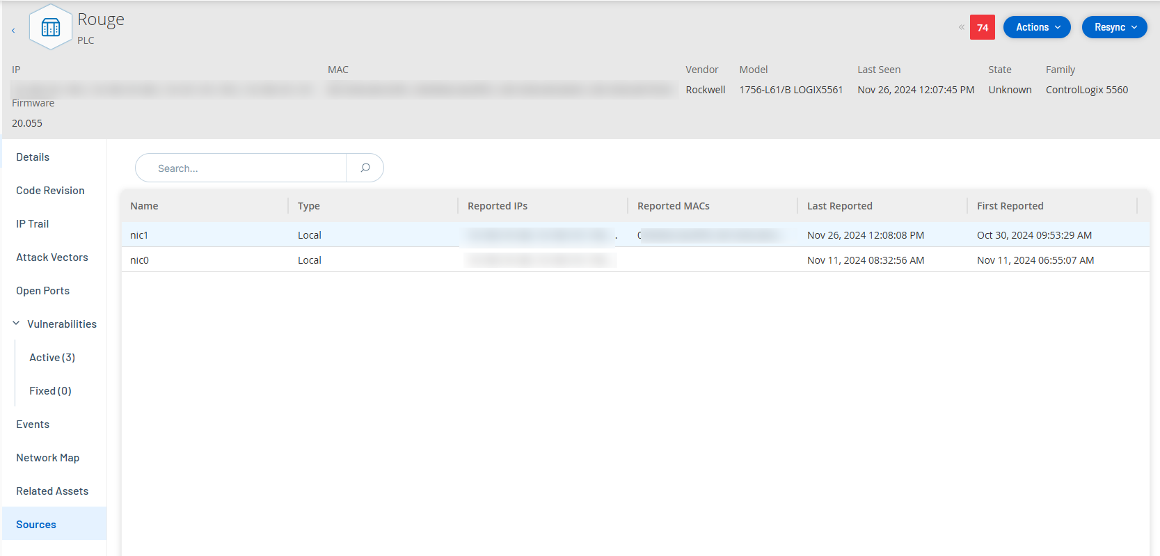MAC signalées Adresses MAC provenant de l'asset source. OT Security signale une adresse MAC si le capteur est suffisamment proche pour observer l'asset. Si le capteur est loin de l'asset, mais observe une communication entre eux, OT Security signale uniquement les adresses IP observées.