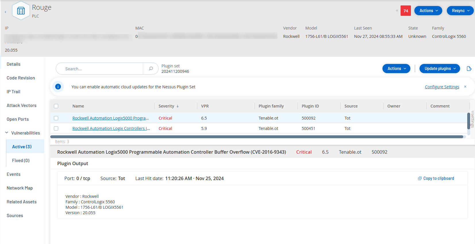 L'onglet Vulnérabilités affiche la liste de toutes les vulnérabilités qui affectent l'asset spécifié, telles qu'elles sont détectées par les plug-ins OT Security. Le système identifie les vulnérabilités, telles que les systèmes d'exploitation Windows obsolètes, l'utilisation de protocoles vulnérables et les ports de communication ouverts connus pour être risqués ou non essentiels pour des types d'appareils spécifiques. Les vulnérabilités sont répertoriées en deux catégories : Actives et Corrigées. Chaque liste affiche des détails sur la nature de la menace et sa sévérité. Les informations contenues dans cet onglet sont identiques à celles de la page