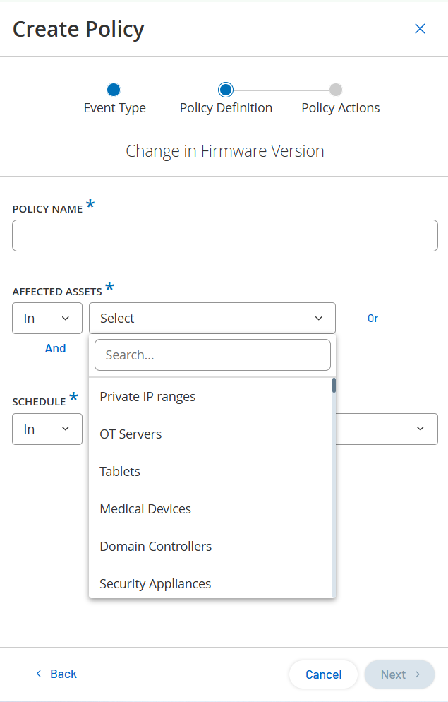 Pour les paramètres d'asset (c'est-à-dire assets sources, cibles et affectés), si vous souhaitez ajouter un groupe d'assets/segment réseau avec une condition « Ou », cliquez sur le bouton bleu « + Ou » à côté du champ et sélectionnez un autre groupe d'assets/segment réseau.