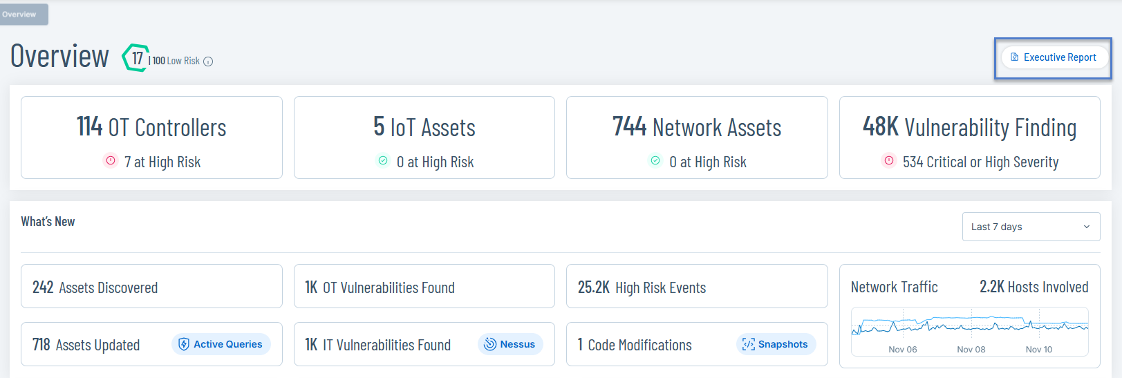 Vous pouvez générer un rapport d'évaluation des risques de votre environnement sur la base des données des 30 derniers jours. OT Security utilise des widgets clés des dashboards Risques, Inventaire et Événements et politiques pour créer un aperçu graphique de haut niveau mettant en évidence les assets à haut risque, les vulnérabilités critiques et courantes, les familles de plug-ins courantes et les assets récemment découverts.