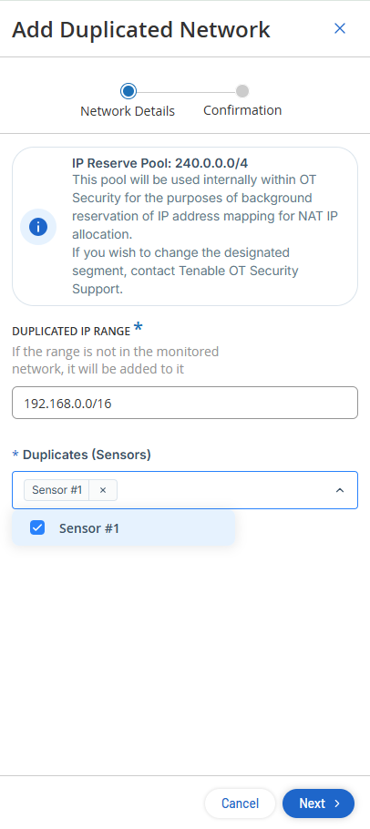 Remarque : OT Security utilise la plage d'adresses IP 240.0.0.0/4 comme groupe de réserve interne pour le mappage d'adresses IP pour l'allocation d'adresses IP NAT. Pour modifier cette plage de groupe de réserve, contactez l'assistance Tenable. -