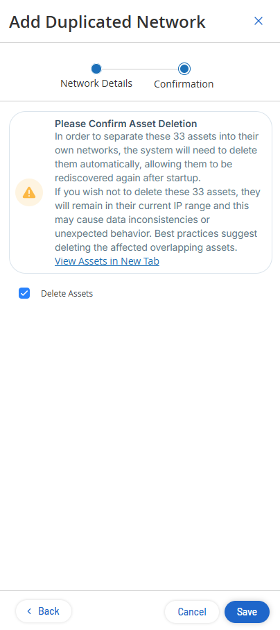 Conseil : pour séparer tous les assets sélectionnés en leurs propres réseaux, Tenable vous recommande d'autoriser OT Security à supprimer les assets et à les redécouvrir après le démarrage. Si vous ne cochez pas la case Supprimer les assets, les assets resteront dans la plage d'adresses IP actuelle, ce qui pourrait provoquer des incohérences ou un comportement inattendu. -
