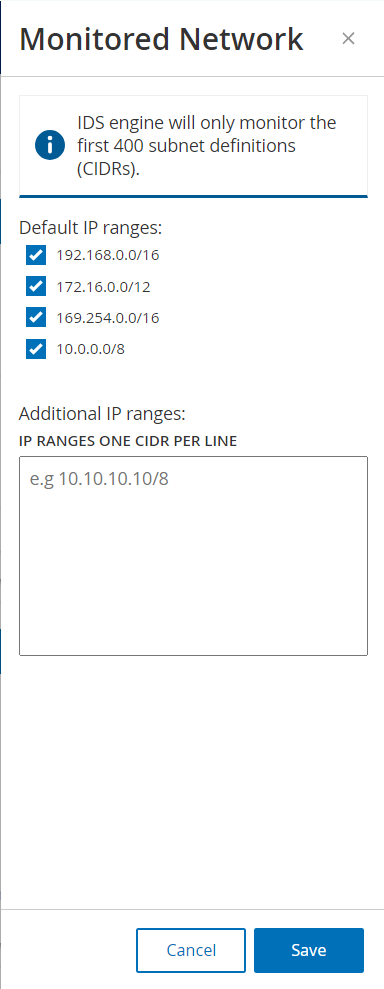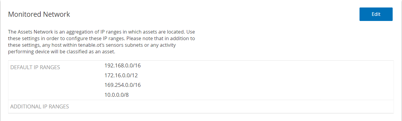 Par défaut, OT Security configure trois plages publiques par défaut : 10.0.0.0/8, 172.16.0.0/12 et 192.168.0.0/16, ainsi que la plage de lien local de 169.254.0.0/16 (APIPA).