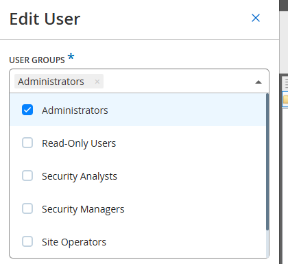 Remarque : le système est livré avec un ensemble de groupes d'utilisateurs pré-définis, correspondant à chacun des rôles disponibles, à savoir Administrators (Groupe d'utilisateurs > rôle Administrator), et Site Operators (Groupe d'utilisateur > rôle Site Operator). Pour une explication des rôles disponibles, voir Utilisateurs locaux. -