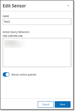 Remarque : les requêtes ne peuvent être effectuées que sur les CIDR inclus dans les plages de réseau surveillées. Veillez à n'ajouter que les CIDR accessibles via ce capteur. L'ajout de CIDR inaccessibles peut interférer avec la capacité de l'ICP à interroger ces segments par d'autres moyens.Remarque : si le capteur fait partie d'un réseau dupliqué, l'adresse IP du réseau dupliqué apparaît dans la zone Réseaux de requêtes actives et ne peut être modifiée. -