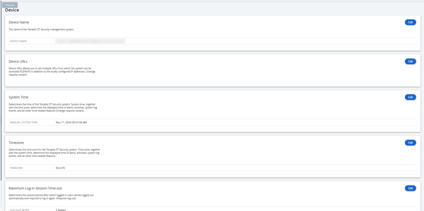 La page Appareil affiche des informations détaillées sur votre configuration OT Security. Vous pouvez afficher et modifier la configuration sur cette page.