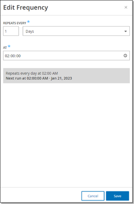 Dans la section À, définissez l'heure de la mise à jour du DFE (heure, minutes, secondes) en cliquant sur l'icône d'horloge et en sélectionnant l'heure, ou en saisissant l'heure manuellement.