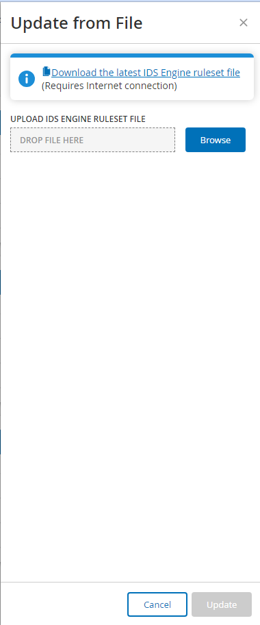Remarque : le téléchargement du dernier fichier d'ensemble de règles du moteur IDS à partir du lien n'est possible que via une connexion Internet, par exemple, avec un PC connecté à Internet.Cliquez sur Parcourir et accédez au fichier d'ensemble de règles du moteur IDS que vous avez téléchargé à partir du portail client de OT Security.