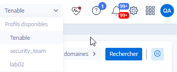 Le coin supérieur droit de l'en-tête Tenable Identity Exposure affiche votre profil de sécurité actif avec un menu déroulant qui vous permet de passer à un autre profil (semblable à la sélection dans les préférences de l'utilisateur).