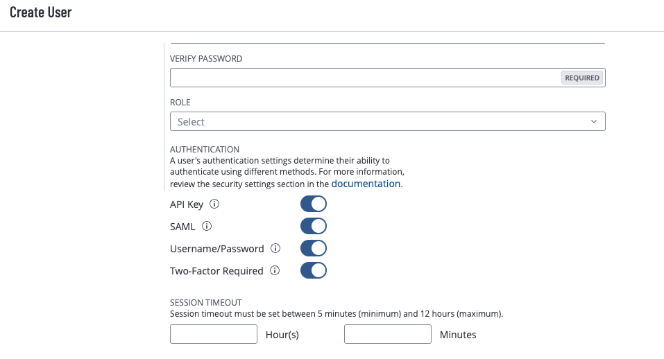 Les administrateurs peuvent désormais définir des délais d'expiration de session lors de la création de nouveaux utilisateurs ou de la mise à jour des utilisateurs existants (individuellement ou en bloc). La valeur par défaut reste 30 minutes, mais les délais d'expiration peuvent désormais être configurés de 5 minutes à 12 heures.